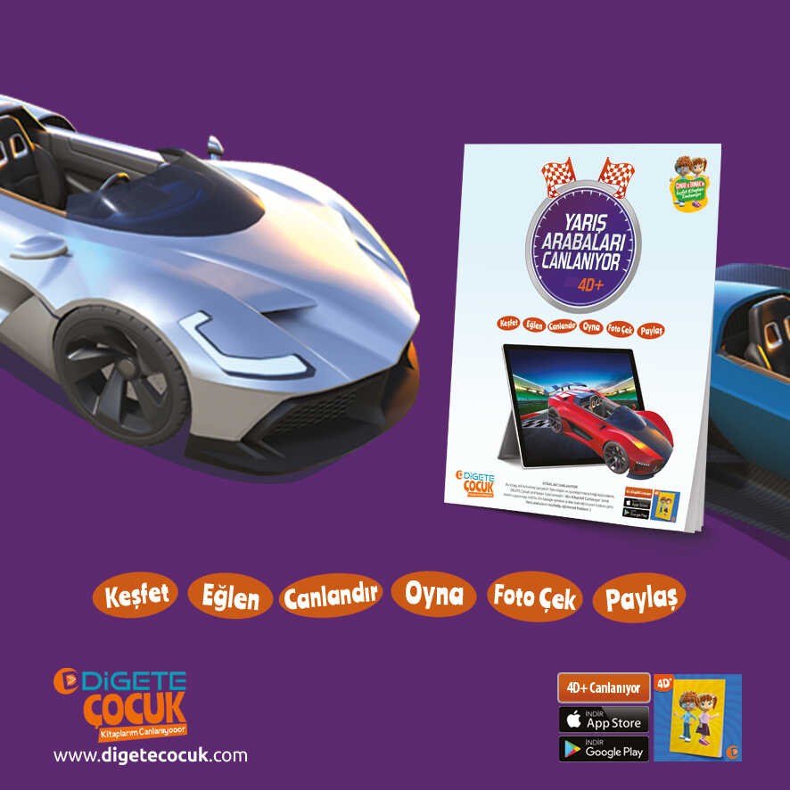 Yarış Arabaları Canlanıyor 4D+ Kitabı; AR- Artırılmış Gerçeklik Teknolojisi ve oyun tekniğiyle, uzmanların katkısıyla Digete Çocuk tarafından hazırlanmıştır. Set içerisinde bulunan ürünler aşağıdaki gibidir;