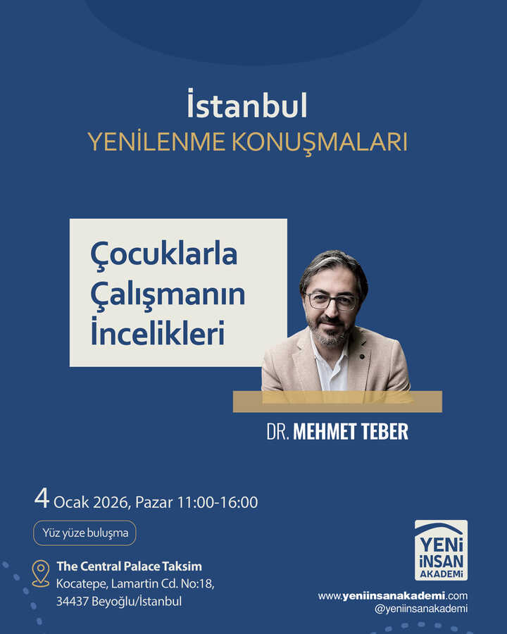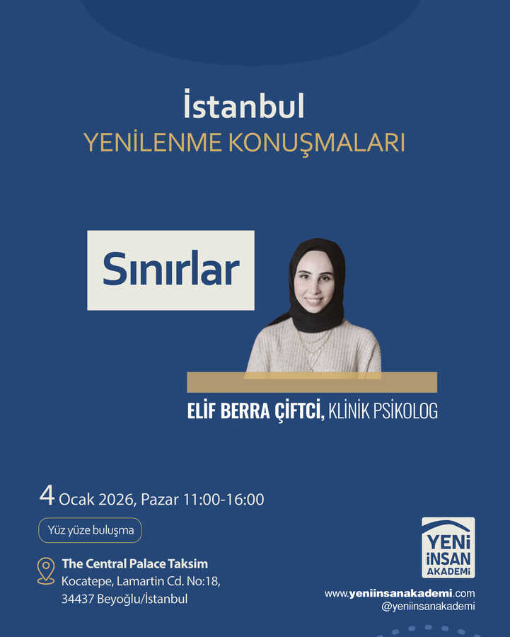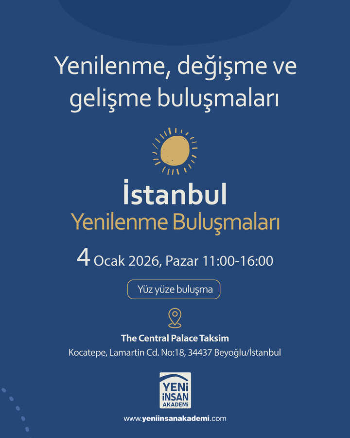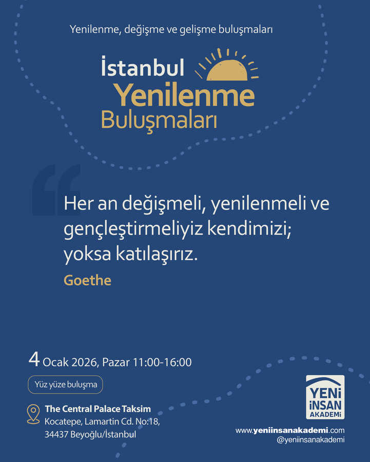 (Program Danışmanı: Dr. Mehmet Teber)04 Ocak Pazar I 11:00-16:00 I Taksim- İstanbulYenilenmeye, değişmeye ve gelişmeye çok ihtiyacımız duyduğumuz bugünlerde “Yenilenme Buluşmaları” isimli yüz yüze buluşma programlarına başlıyoruz.